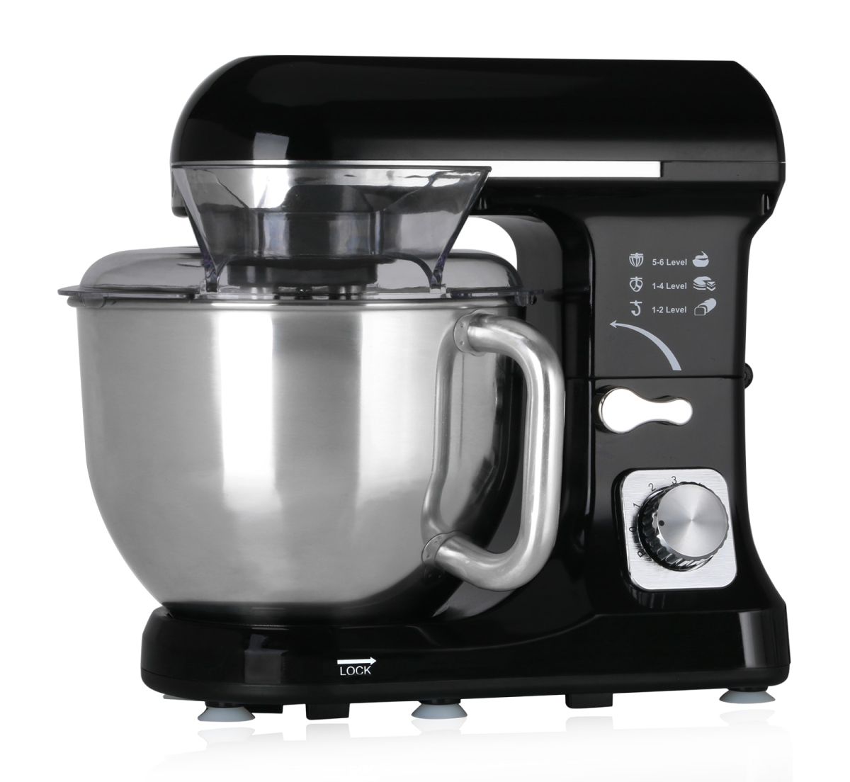 6 скоростей, откидная головка, съемная 5 л дежа из нерж.стали с ручкой, с защитной крышкой, 3 насадки (крюк, плоский битер, цельнометаллический венчик), материал корпуса ABS пластик, цвет черный, 1 кВт, 220 В