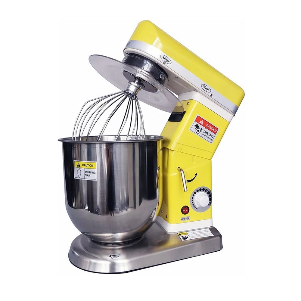 Миксер планетарный настольный VIATTO VA-SMB10Y используется на предприятиях общественного питания, торговли, небольших кондитерских и пекарнях. Дежа изготовлена из нержавеющей стали. Имеется защитная крышка из пластика. Минимальная/максимальная загрузка муки: 200-1000 гр. теста: 300-1500 гр. яичных белков: 3-28 шт. Плавная регулировка скорости: вращение венчика вокруг оси: 0-1000 об/мин, вокруг дежи: 0-320 об/мин. В комплекте 3 насадки, полностью изготовленные из металла: крюк и лопатка – из нержавеющей стали, венчик – из алюминия и нержавеющей стали. Корпус из окрашенного металла. Цвет желтый.